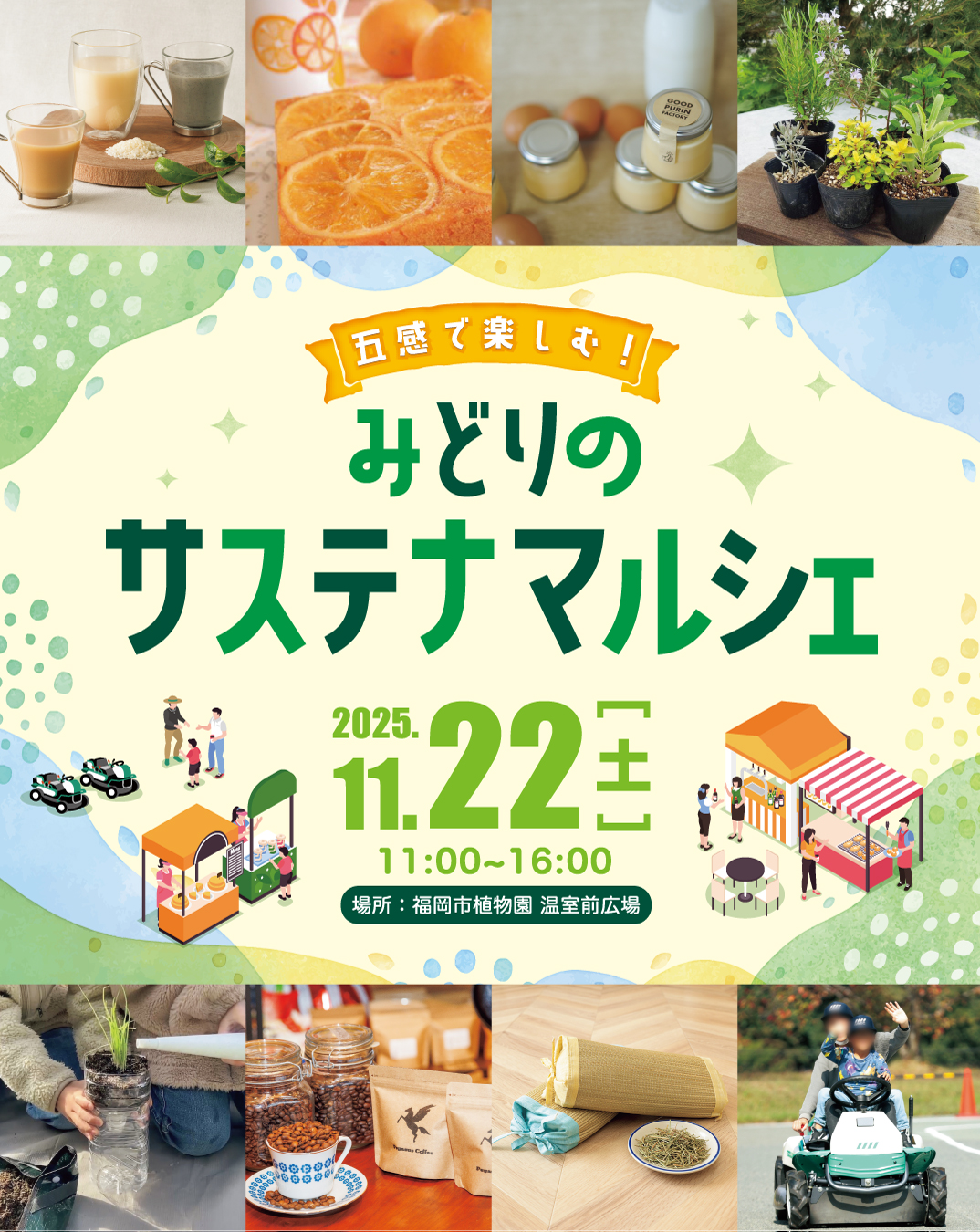 11月22(土)に、福岡市植物園 温室前広場にて「五感で楽しむ!みどりのサステナマルシェ」を開催します。