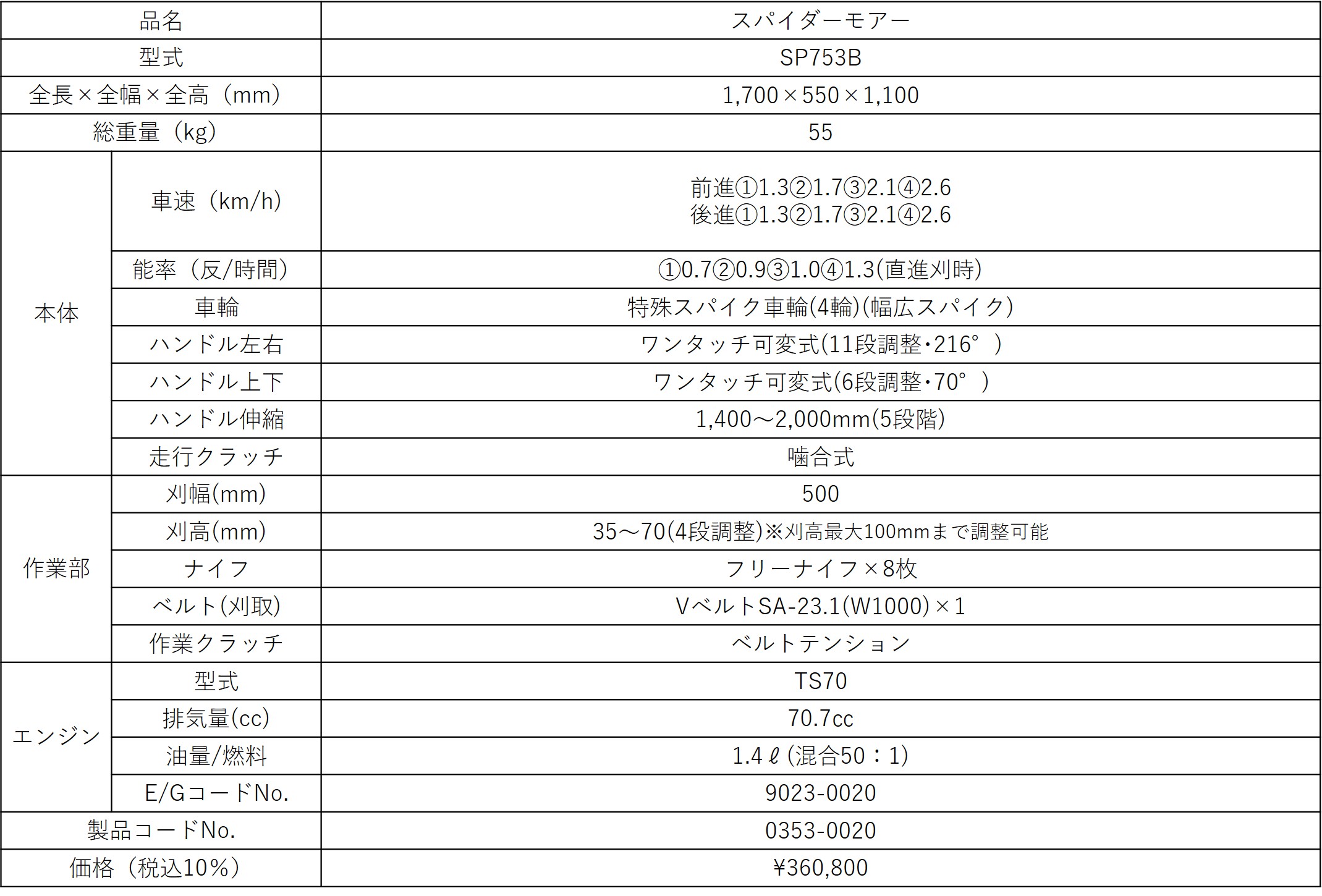 本製品は、スパイダーモアーシリーズの新ラインナップで、2ストロークのWillbeエンジンを搭載しています。また、走行ブレーキ採用により、草刈り時の制動距離が短くなりました。(※SP853A比)