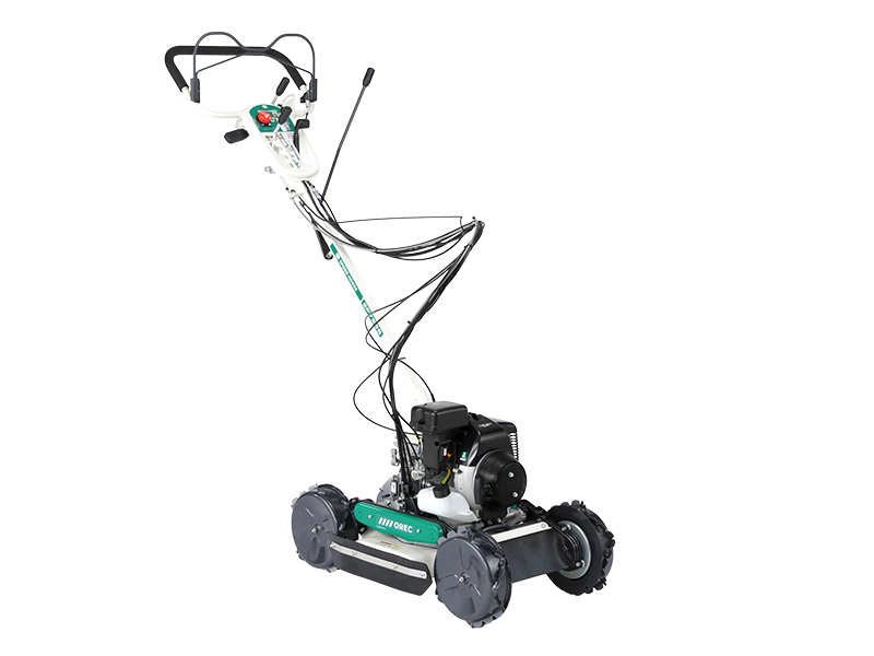 排気量70㏄のパワーと最高車速2.6km/hでパワフルな草刈りを実現。また、スパイク車輪が地面に食い込み、4輪駆動で傾斜地の草刈りも快適に行います。